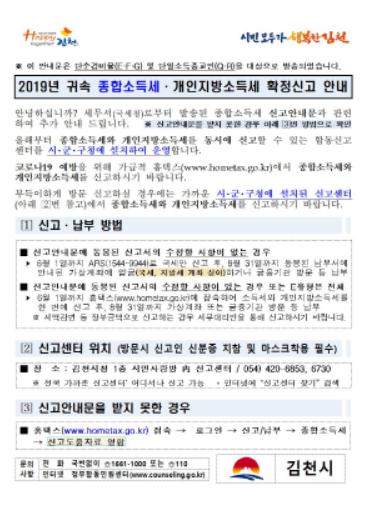 김천시는 지난 15일 종합소득세 모두채움신고 대상자(F·G·Q·R)에게 종합소득세 및 개인지방소득세 신고 추가안내문을 발송했다.