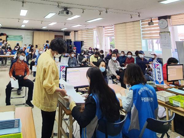 우정동 행정복지센터는 긴급재난지원금의 원활한 지급을 위해 공공일자리 등 추가인력을 배치했으며, 접수에 있어 주민의 불편을 최소화하기 위한 동선으로 접수처를 배치했다.