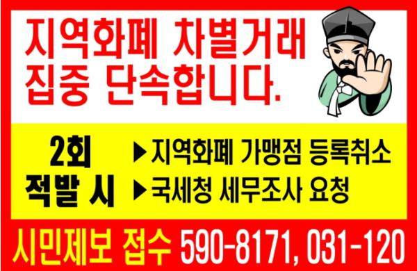 또한 시 재난상황실 내에‘재난지원금 차별거래 민원신고센터’를 설치하여 15일부터 시민제보를 받고 있으며, 필요시 현장점검을 통해 지역화폐 차별거래 등을 단속하고, 2차 적발 시에는 지역화폐 가맹점 해지, 국세청 세무조사 요청 등의 강력한 조치를 취할 방침이다.
