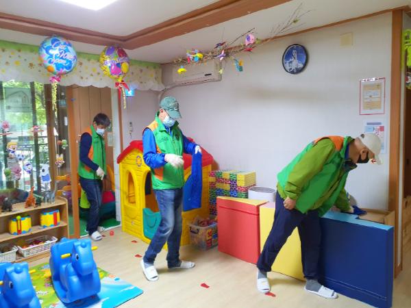 이날 동두천지킴이는 환경부 승인받은 소독액으로 출입문, 바닥, 손잡이, 승강기, 화장실, 테이블, 의자, 놀이기구 등의 표면을 걸레를 이용하여 구석구석 소독하고, 어린이집에 생활소독방법과 환기 등의 유의사항에 대해서도 안내했다.