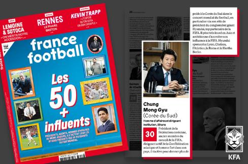 정몽규 대한축구협회(KFA) 회장이 프랑스 주간지 ‘프랑스 풋볼’이 선정한 축구계 영향력 있는 인물 50인 중 30위에 선정됐다.
