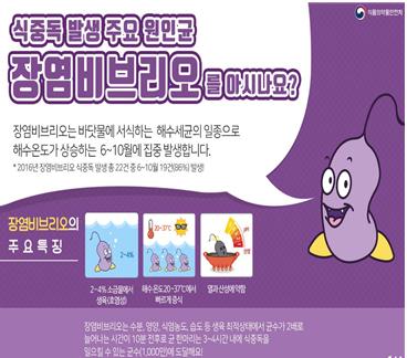 장염비브리오(원인균 : Vibrio parahaemolyticus)는 바닷물에서 생존하는 식중독균으로, 최근 3년간 수온이 상승하는 여름철(7~9월)에 장염비브리오 환자(597명)의 95%가 집중적으로 발생했다.