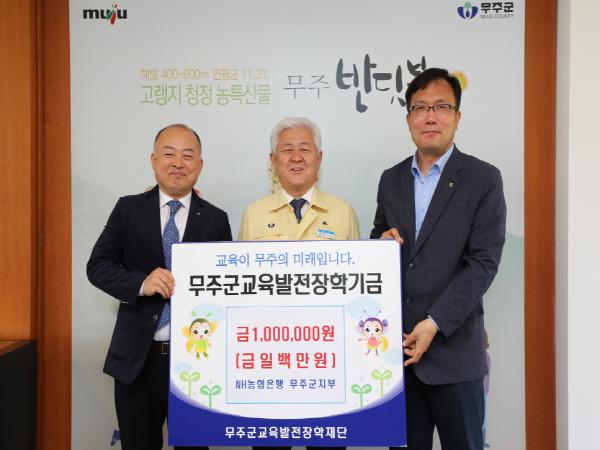 농협중앙회 무주군지부(지부장 황석관)가 지난 20일 (재)무주군교육발전장학재단에 장학금 1백만 원을 기탁했다.