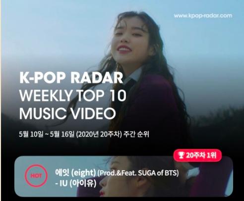 아이유의 ‘에잇(Prod.&Feat. SUGA of BTS)’ 뮤직비디오는 지난 10일부터 16일까지 집계한 2020년 20주차 주간 케이팝 레이더 주간 유튜브 조회수 차트에서 1,203만 뷰를 추가하며 2주 연속 케이팝 레이더 1위에 올랐다.