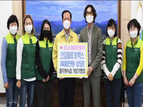 이어서 풀무원녹즙 거창가맹점(점장 임무성)에서도 건강음료 91박스(400만원 상당)를 기탁했고, 임무성 점장은 “코로나19로 인해 심신이 지친 군민들에게 도움이 되고 싶어 이렇게 기부를 하게 됐다”고 소감을 밝혔다.