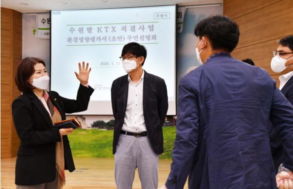 경기도의회 김직란 도의원(더불어민주당, 수원9)은 지난 19일. 한국철도시설공단 주관으로 열린 ‘수원발 KTX 환경영향평가 주민설명회’에 참석하여 대기질 및 소음·진동 등 영향예측 제외한 사유 설명과 수원역 환승주차장 증설 필요, 경부선 선로 주변 방음벽 추가 설치, 센트럴타운3단지 소음측정 등을 요구하고, “지역주민과 관련 부서 간의 소통이 필요하다”는 점을 강조하였다.