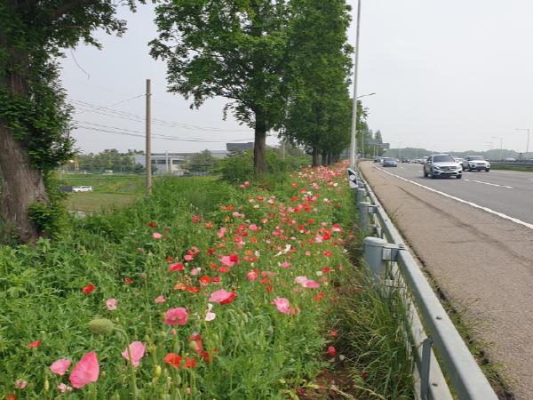 자유로에 양귀비꽃이 개화해 파주시를 방문하는 관광객들을 맞이하고 있다.