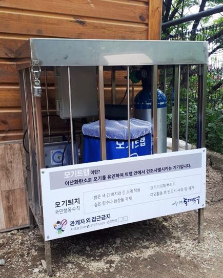 구는 이산화탄소를 이용해 모기를 유인해 사멸시키는 ‘친환경 모기트랩’16대를 지역 내 근린공원(배봉산, 답십리, 홍릉 등) 및 하천변 주요 지점에 설치.운용한다.