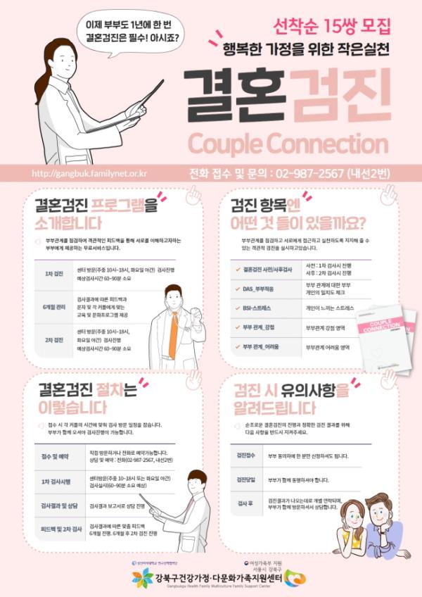 서울 강북구(구청장 박겸수)는 5월 21일 부부의 날을 맞아 강북구건강가정·다문화가족지원센터(센터장 한은주) 주관으로 선착순 총 15쌍의 부부를 대상으로 결혼검진 프로그램을 진행한다.