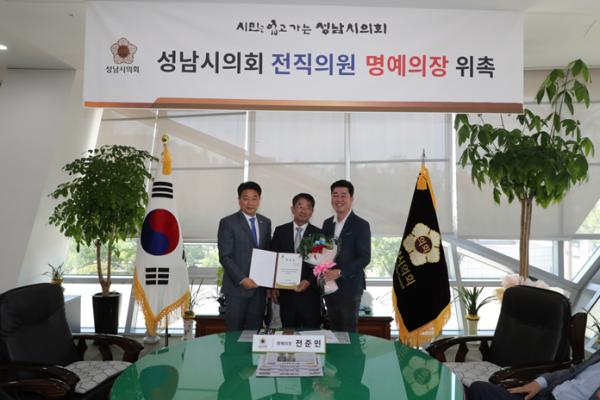 성남시의회(의장 박문석)는 21일 전준민 전 의원을 일일 명예의장으로 위촉하며 전?현직 의원 간 화합의 시간을 가졌다.