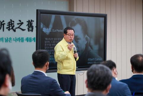 이어서 조 시장은 「코로나19 새로운 도전」이라는 제목으로 코로나 이후의 변화와 전망, 우리가 해야 할 일들을 설명하며 비대면·비접촉의 일상화, 온라인 시장의 급성장, 디지털 온라인 마케팅에 집중하게 되는 코로나 이후 시대의 유망직종으로 의료, 안전, 환경, 로봇 등을 꼽았다.