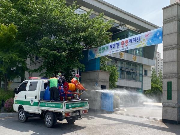 시는 학교 개학에 맞춰 지난 19일 구리시 지역자율방재단과 합동으로 갈매고등학교 등 고등학교 7개소 정문 및 주변 지역에 대해 촘촘한 방역을 실시했다. 또한 오는 25일과 26일에는 초·중학교 25개에 대한 방역 활동을 실시할 계획이다.