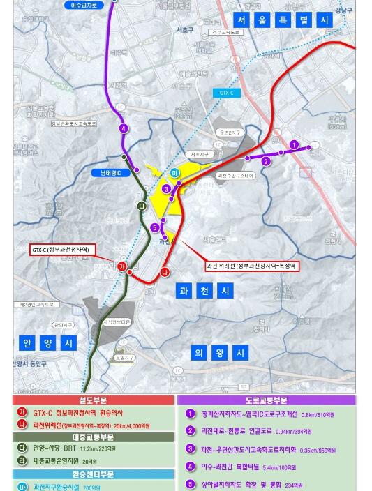 과천지구에는 철도, 도로, 대중교통, 환승센터 등 4개 부문에서 10개의 사업이 추진된다.