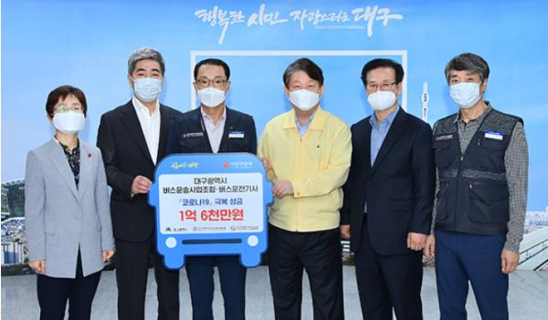 권영진 대구시장은 “지역사회를 위해 성금 기부에 동참해 주신 시내버스업체 관계자와 운전기사 분들께 감사드린다. 모두가 어렵고 힘든 시기에 각계각층에서 보내주신 따뜻한 온정이 코로나19를 극복할 수 있는 큰 원동력이 되고 있다”며 감사의 뜻을 전했다.