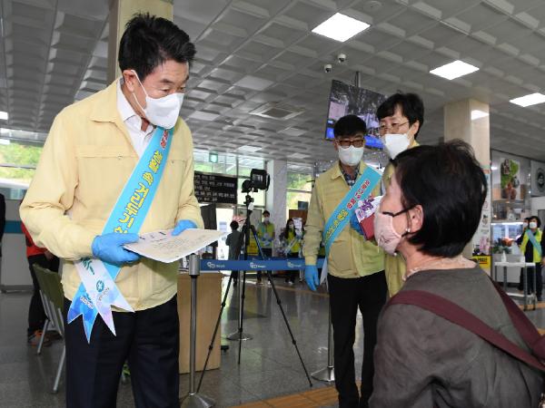 경북 영주시(시장 장욱현)는 지난 22일 영주역, 터미널 및 주요 관광지에서 시청 공무원 300여명이 참석한 가운데 ‘코로나19’ 예방과 함께 ‘포스트 코로나’대비 지역 경제 활성화를 위한 「클린&안심 영주」 캠페인을 실시했다.