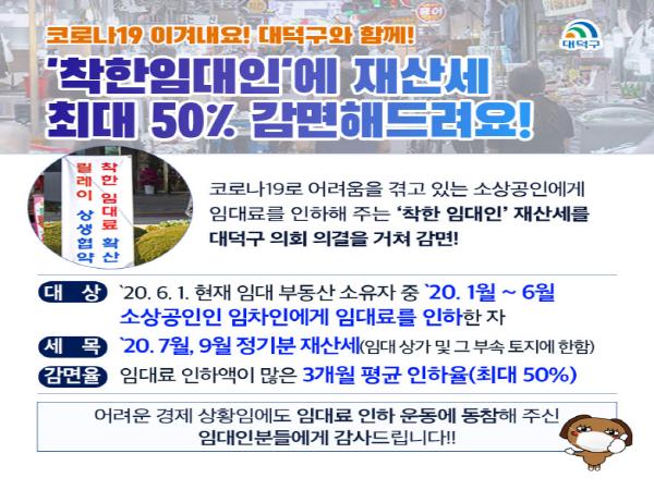 대전 대덕구(구청장 박정현)가 코로나19로 어려움을 겪고 있는 소상공인에게 임대료를 인하해 준 착한 임대인의 재산세(건축물분, 토지분)를 감면해 준다.