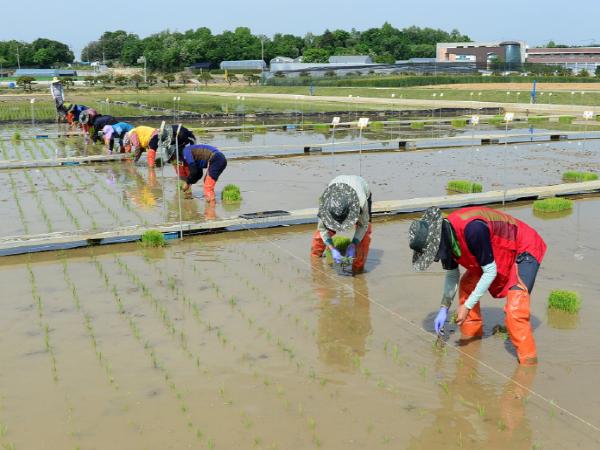 반면에 충청북도농업기술원의 관계자들이 청풍흑찰 등 우수한 품종 개발을 위해 1백 50여 개 품종의 연구용 벼를 시험포장에서 손 모내기를 하고 있다.