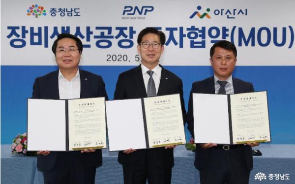 양승조 충남지사는 22일 도청에서 오세현 아산시장, 최양환 피엔피 대표와 투자협약(MOU)을 체결했다.