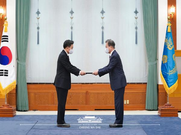 문 대통령은 신임장 수여식 이후 진행된 환담에서 대한민국을 대표하는 재외공관장으로 임명된 것을 축하하고 격려했다. 아울러 코로나19 팬데믹 상황에서 부임하게 된 점을 감안, 신임 대사와 가족 그리고 재외공관에서 근무 중인 직원들의 건강에 문제가 없도록 만전을 기해 줄 것을 당부했다.