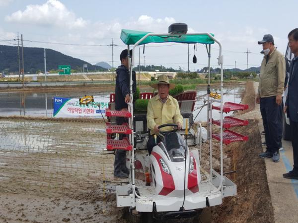 무안군(군수 김산)은 본격적인 영농철을 맞아 지난 21일 일로읍 평정마을 들녘에서 박영수 일로농협장 등 관계자 30여 명이 참석한 가운데 농작업 대행 모내기 시연회를 진행했다고 밝혔다.