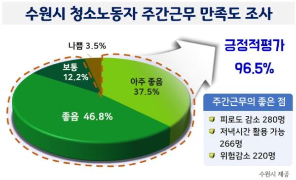 수원시가 지난 4월 1~3일 13개 청소대행업체 근로자 515명을 대상으로 만족도 조사를 진행한 결과, ‘아주 좋음’ 193명, ‘좋음’ 241명, ‘보통’ 63명 등 96.5%가 긍정적인 평가를 했다.