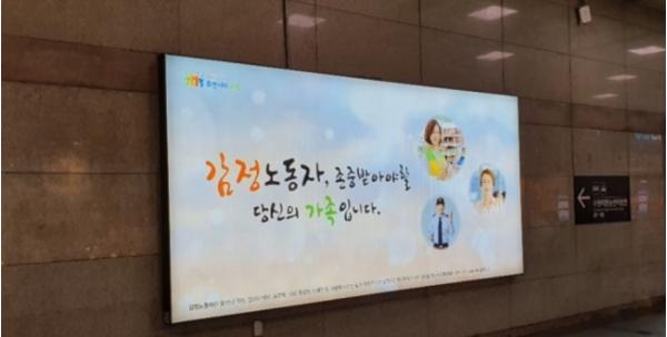 수원시는 경비원·콜센터직원·식당 종업원 등 감정노동자를 존중하는 사회 분위기를 만들기 위해 지난해 말부터 유동 인구가 많은 수원역사 내에 공익광고를 게시하고 있다. 광고에는 ‘감정 노동자, 존중받아야 할 당신의 가족입니다’라는 문구가 적혀있다.