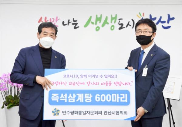안산시(시장 윤화섭)는 민주평화통일자문회의 안산시협의회로부터 즉석 삼계탕 600마리(400만원 상당)를 기탁 받아 코로나바이러스감염증-19(코로나19) 확산 방지를 위해 땀 흘리는 의료진에게 전달하기로 했다고 25일 밝혔다.