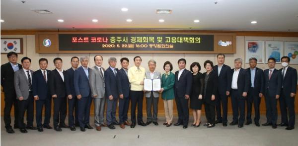 이날 회의는 포스트 코로나 시대의 고용축소와 소상공인 경영 악화에 따른 일자리 절벽 문제에 능동적으로 대응하고 충주지역 고용 프로젝트 운영과 충주지역 기업 생산품 팔아주기 운동 등 지역경제 회복을 위한 대책 논의로 진행됐다.
