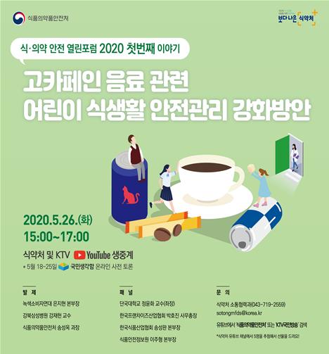 식품의약품안전처(처장 이의경)는 오는 26일 소비자단체·학계·업계와 함께 ‘고카페인 음료 관련 어린이 식생활 안전관리 강화방안’을 주제로 ‘제1회 식·의약 안전 열린포럼 2020’을 비대면 방식의 온라인 형태로 개최한다고 밝혔다.