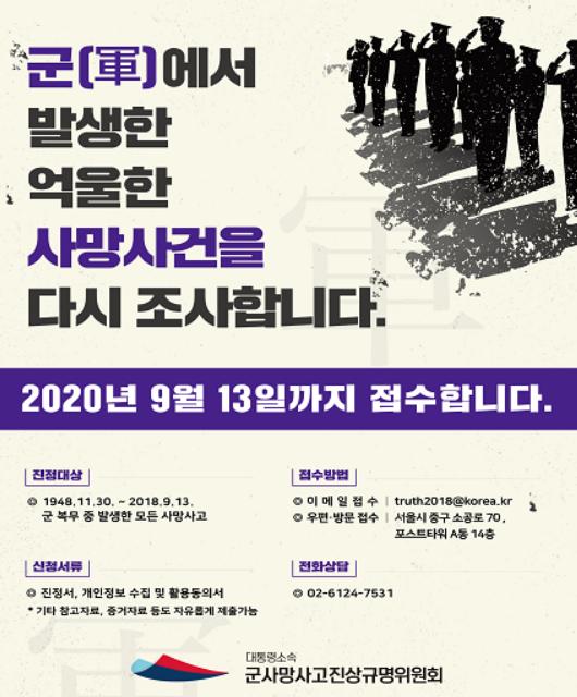 특별법에 따라 2018년 9월 설립된 ‘대통령소속 군사망사고진상규명위원회’는 ‘군의문사’ 뿐만 아니라 ‘사고사·병사·자해사망(자살)’ 등 ‘48. 11. 30.부터 ’18. 9. 13.에 발생한 모든 군사망사고에 대해 진정신청을 받는다.