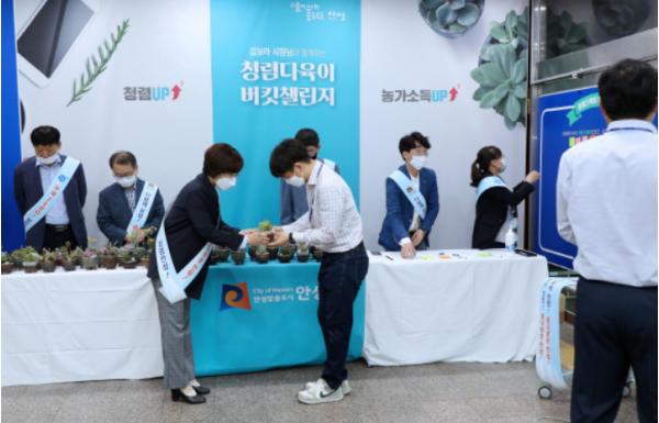 안성시는 25일, 청렴 다육이 버킷 챌린지 ‘화훼농가에 웃음을 주는 청렴다짐’ 캠페인을 실시하며, 직원들과 청렴 다육이를 나누는 행사를 진행했다.