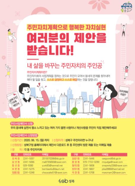 사업제안서는 성북구 주민이면 누구나 가능하며, 성북구청 홈페이지(http://www.sb.go.kr)에서 서식을 내려받아 작성 후 6월 15일까지 동주민센터 방문제출 혹은 이메일로 제출하면 된다.