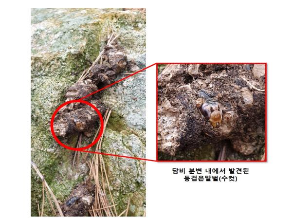 국립수목원은 경북대학교 연구팀(연구책임자 최문보 연구교수)과 공동연구 수행 중 산림지대(경북 청도군 일대)에 서식하는 담비의 분변을 수거하여 검토한 결과 담비가 등검은말벌 집을 공격하여 포식하는 포식 천적임을 세계 최초로 확인하였다.