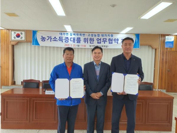 고성군 대가찰벼작목반(반장 정종선)과 고성농협 대가지점(지점장 정의국)은 5월 25일 오전 11시 대가면사무소 회의실에서 장영권 대가면장을 비롯해 찰벼작목반원 10여 명이 참석한 가운데 ‘농업인 소득증대를 위한 업무 협약’을 체결했다.