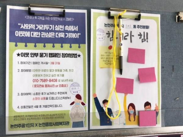 논현종합사회복지관(관장 최장열)에서는 코로나19 극복을 위한 ‘이웃 안부묻기 캠페인’을 3월 한 달 동안 진행했다.