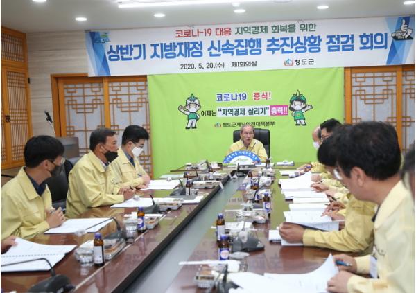 청도군(군수 이승율)은 지난 19일 청도군청 제1회의실에서 코로나-19 대응 지역경제회복을 위한 지방재정 신속집행 추진상황 점검회의를 가졌다. 군은 매일 아침 코로나19 방역대책 확대간부회의와, 농번기를 맞아 인력수급이 어려운 농가를 대상으로 전공무원 농촌일손돕기를 실시하면서 불가피하게 저녁시간에 회의를 진행하게 되었다고 밝혔다.
