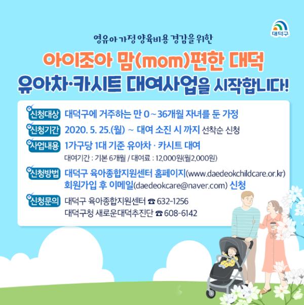 대전 대덕구(구청장 박정현)가 25일부터 저출산 위기 속 영유아가정의 양육부담을 경감하고 아이 낳고 기르기 좋은 환경을 조성하기 위한 시책으로 ‘아이조아 맘(mom)편한 대덕, 유아차ㆍ카시트 대여사업’을 추진한다.