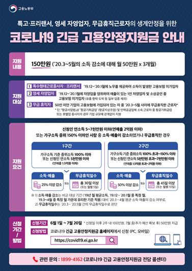 한편, 코로나19 긴급 고용안정지원금은 6월 1일부터 7월 20일까지 전용 홈페이지(covid19.ei.go.kr)에서 신청할 수 있으며, 기타 자세한 문의사항은 전담 콜센터(☎1899-4162)를 통해 안내받을 수 있다.