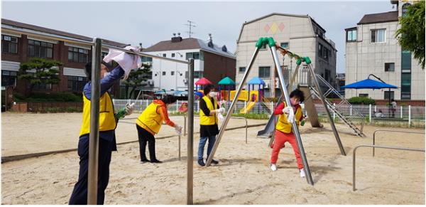 대전 서구(구청장 장종태) 월평1동은 지난 25일 코로나19 지역사회 확산 방지를 위해 민·관 합동 방역단이 초등학교 저학년 등교를 앞둔 관내 월평초등학교 내 놀이시설과 운동기구 및 휴식공간의 소독 방역을 실시했다고 밝혔다.