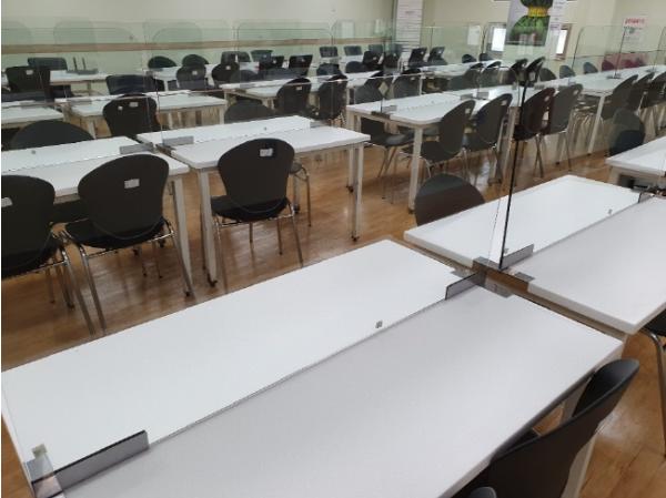 광진구(구청장 김선갑)가 잠정 중단되었던 복지관 내 경로식당 운영이 6월 1일부터 재개됨에 따라 코로나19 예방을 위해 ‘투명 가림막’을 설치했다.