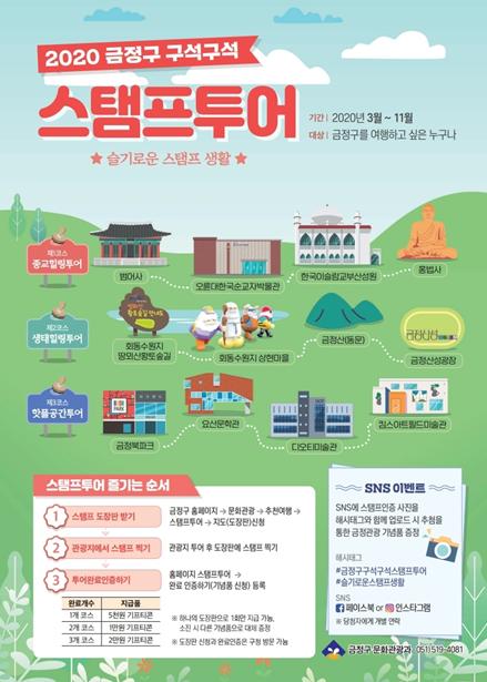 ‘금정 구석구석 스탬프 투어’는 작년에 이어 올해에도 관광 활성화 및 관광객 적극 유치를 위해 추진하는 것으로 생태관광해설사 투어연계, SNS이벤트 운영 등 다양한 재미를 더한다. SNS인증이벤트는 SNS(페이스북, 인스타그램)에 스탬프인증 사진을 업로드하면 추첨을 통해 구 관광기념품을 증정할 예정이다.