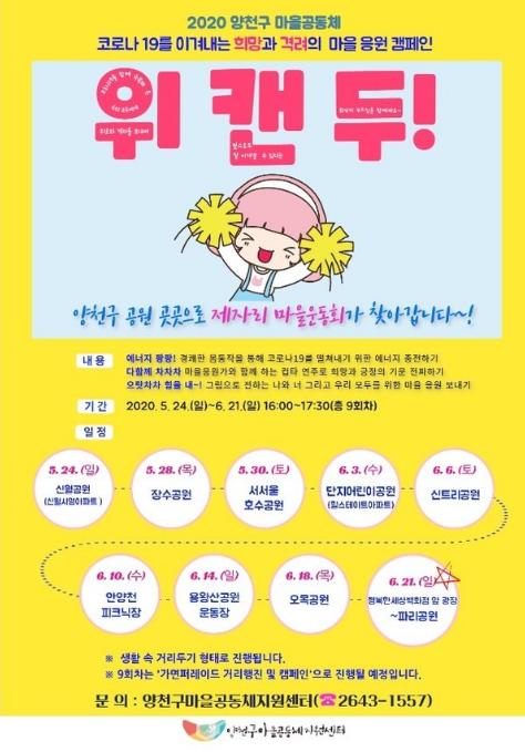 「위 캔 두 !」마을 응원 캠페인은 8곳의 관내 공원을 각 일정별로 순회하면서 에 너지 충전·긍정의 기운 전파·응원 보내기의 내용으로 구성된 ‘제자리 마을운동회’라 는 프로그램을 진행해 희망과 긍정의 메시지를 나눈다는 의미를 담고 있다.
