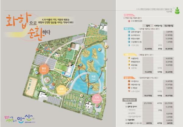지난해 9월 정부(국무조정실) ‘4·16 세월호참사 피해자 지원 및 희생자 추모위원회’가 의결한 ‘안산시 추모시설 건립 계획’에 따라 ‘화합으로 순환하다’라는 테마로 추진되는 화랑유원지 명품화 리모델링 사업은 ▲기억과 다짐, 약속의 공간(생명안전공원) ▲상처를 치유하고 나누는 공간 ▲화합을 꿈꾸는 공간 ▲일상의 즐거움을 누리는 공간 등 4개의 주제로 289억(국 208억·도 40억·시 41억) 원이 투입돼 화랑유원지 61만8천여175㎡에서 진행된다.