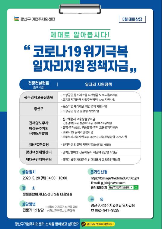 광산구(구청장 김삼호)가 28일 코로나19로 고용유지에 어려움을 겪고 있는 중소기업과 소상공인을 위해 평동종합비지니스센터에서 테마 상담을 실시한다.