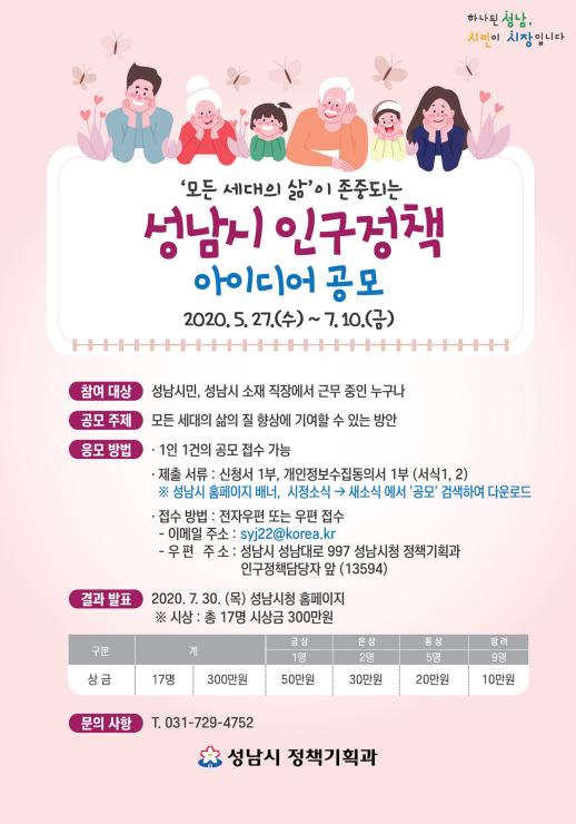 성남시는 5월 27일부터 오는 7월 10일까지 인구정책에 관한 시민 아이디어를 공모한다.
