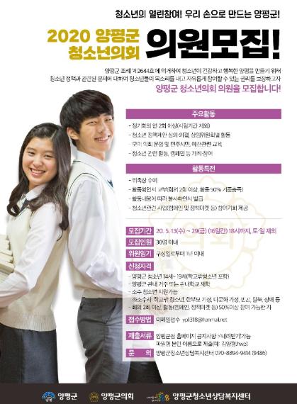양평군(군수 정동균)은 2020년 5월 13일부터 5월 29일까지, 양평군을 대표해 청소년의 목소리가 지역사회로 전해지도록 적극적으로 활동할 ‘양평군 청소년의회 의원’을 모집한다.