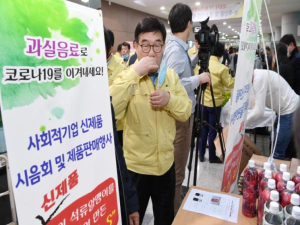 이번 행사는 코로나19로 인해 신제품을 출시하고도 유통업체 방문 영업활동을 하지 못하는 관내 사회적기업의 애로사항을 알게 된 시에서 매주 금요일 오후 3시에 진행되는 중소기업 제품 팔아주기 및 농축산물 직거래 장터와 연계해 행사장을 찾는 공무원과 시민들을 대상으로 시음행사 및 판매행사를 진행했다.