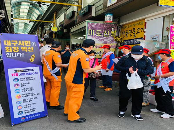 이번 방역 훈련에는 전통시장 자율소방대와 의용소방대 등 소방 협력단체 1,400여 명이 참여했다. 이들은 전통시장 구석구석 소독과 함께 대구형 7대 기본생활수칙을 홍보하고 행동요령을 시연해 이용객들의 관심을 끌었다.