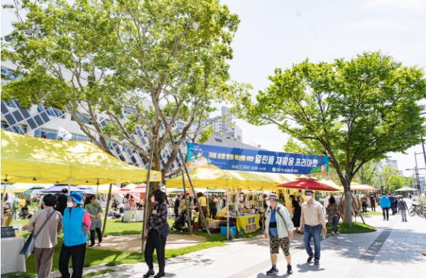 강동구(구청장 이정훈)가 27일(수) 오전 10시~오후 2시, 구청 열린뜰에서 ‘열린뜰 재활용 플리마켓’을 열었다. 자원순환 문화 확산을 위해 강동구 주최, 핑크빛 협동조합(이사장 임서영) 주관으로 마련한 행사로, 중고장터, 재활용 체험, 재활용품 수거·홍보부스, 청년상인 푸드트럭 등 80여 개 부스가 운영됐다.