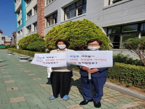 조광의 위원장은 이날 학생들이 잊지 않고 자가진단을 할 수 있도록 김경관 귀인초 교장, 황윤숙 귀인초 운영위원장, 최석진 귀인중 교장 및 김연희 귀인중 운영위원장과 함께 학교 정문에서 안내피켓을 들고 등교하는 학생들을 대상으로 학생건강 자가진단 방법을 안내하였다.
